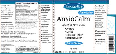 - AnxioCalm is clinically studied to significantly relieve occasional anxiety and stress without daytime drowsiness. No salt yeast wheat gluten corn soy artificial flavoring or artificial preservatives. Developed by Researchers at the Hungarian Academy of Sciences. Budapest Hungary Product of Hungary AnxioCalm is the safe and effective way to help relieve occasional: Anxiety Stress Nervousness and worry And related symptoms such as: Nervous sweating Upset stomach Muscle tension Insecurity Occasional restless sleep Fast-acting Relief of occasional Anxiety Stress Nervous tension Restless sleep Safe and effective Non-GMO Anxiocalm is perfect for everyday use or occasionally as needed. It provides relief without daytime drowsiness or mental fogginess. It's non-drowsy non-addictive and safe. For adults and children (ages 4 and up).