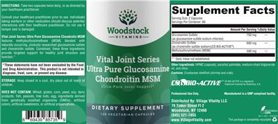 - Vital Joint Series Ultra Pure Glucosamine Chondroitin MSM features methylsulfonylmethane (MSM) blended with naturally occurring clinically researched glucosamine sulfate and chondroitin sulfate. Combined these three ingredients provide targeted support for healthy joint structure and function. Does not contain: Wheat gluten corn yeast soy dairy products fish peanuts tree nuts egg ingredients derived from genetically modified organisms (GMOs) artificial colors artificial sweeteners or artificial preservatives. Ultra-pure joint support Manufactured in a GMP compliant facility. Vegetarian Caps