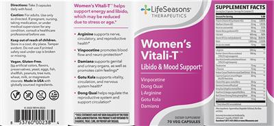 - Vegan. Gluten-Free. No artificial colors flavors preservatives yeast eggs fish shellfish peanuts tree nuts wheat milk or magnesium stearate. Made in USA with globally sourced ingredients. Women's Vitali-T helps support energy and libido which may be reduced due to stress and age. Arginine supports nerve circulatory and reproductive health. Vinpocetine promotes blood flow and neuro protection Damiana supports genital and urinary organs as well as promotes calm feelings Gotu Kola supports vitality circulation and nervous system health Dong Quai helps regulate the reproductive system and support circulation Women's Vitali-T helps support energy and libido which may be reduced due to stress and age. Libido & mood support Vinpocetine Dong Quai L-Arginine Gotu Kola Damiana