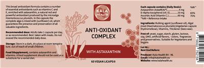 - This broad antioxidant formula contains a number of essential antioxidants such as Vitamins C and E enriched with astaxanthin a natural red and powerful antioxidant produced by the microalga Haematococcus pluvialis. In the capsule the complete alga is mixed with (sunflower) oil which guarantees the presence and preservation of all valuable ingredients. Food supplement contains astaxanthin and vitamins. Anti-Oxidant Complex with astaxanthin Free of: Yeast sugar starch gluten lactose soy GMO artificial flavors; colors fragrances and preservatives. Suitable for vegetarians and vegans.