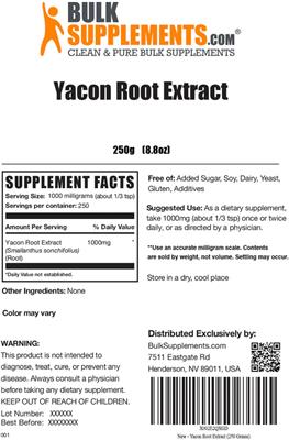 | Yacon extract | botanical | 1000 | mg | N/A | Adults and children 4 or more years of age | 1000 mg |
