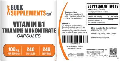 - Vitamin B1 Thiamine Mononitrate 100 mg per serving Free of: Soy dairy yeast gluten
