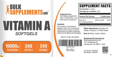 - Vitamin A softgels 10000 IU per serving Free of: Dairy yeast gluten
