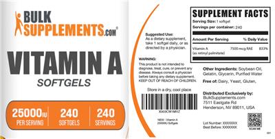 - Vitamin A softgels 25000 IU per serving Free of: Dairy yeast gluten
