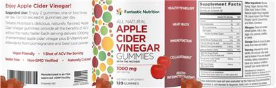 - Fantastic Nutrition's delicious naturally flavored Apple Cider Vinegar gummies provide all the benefits of ACV without the nasty taste! Each serving delivers 1000mg of concentrated apple cider vinegar plus B-vitamins and antioxidants from pomegranate and beet juice powder. 1 Shot of ACV per serving Vegan friendly Gelatin free Non-GMO verified Naturally colored Manufactured in an FDA approved cGMP facility. All natural Healthy metabolism Heart health Immune function Cellular energy Healthy intermittent fasting Apple Cider Vinegar Gummies 1000mg per serving With the mother Allergens: Does not contain; wheat gluten milk or dairy eggs soy peanuts shellfish or yeast.