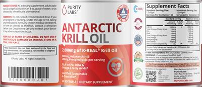 - 2000 mg of K REAL Krill Oil 800mcg Astaxanthin & 400mg Phospholipids per serving Rich in EPA DHA & Omega-3 fatty acids K REAL Certified sustainable & traceable The Antarctic Krill in this product comes from a fishery that has been independently certified to the MSC's standards for a well-managed and sustainable fishery. www.msc.org No preservatives or artificial colors. Free of trans-fats sugar lactose soy sodium and magnesium stearate. Gluten & GMO-free.