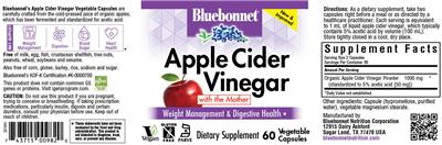 - Bluebonnet's Apple Cider Vinegar vegetable capsules are carefully crafted from the cold-pressed juice of organic apples which has been fermented and standardized for acetic acid. May support Weight management Digestion Blood sugar Heart health Free of milk egg fish crustacean shellfish tree nuts peanuts wheat soybeans and sesame. Also free of corn gluten barley rice sodium and sugar. Bluebonnet's KOF-K Certification #K-0000700 This product does not contain common GE genes or proteins. Visit igenprogram.com IGEN Non-GMO Tested Apple Cider Vinegar with the Mother Weight management & digestive health Vegan Gluten free K Parve (Kosher)