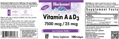 - Bluebonnet's Vitamin A & D3 7500 mcg / 25 mcg Softgels are formulated with vitamin A and vitamin D3 (cholecalciferol) from molecularly distilled deep sea cold water fish liver oil to help support eye health and immune function. May support Eye health Immune function Free of milk egg crustacean shellfish tree nuts peanuts wheat and sesame. Also free of corn gluten barley rice sodium and sugar. Made in USA from imported and domestic ingredients Molecularly Distilled Eye & immune health Gluten free