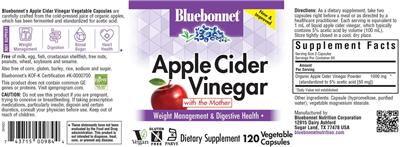 - Bluebonnet's Apple Cider Vinegar vegetable capsules are carefully crafted from the cold-pressed juice of organic apples which has been fermented and standardized for acetic acid. May support | Weight management | Digestion | Blood sugar | Heart health Free of milk egg fish crustacean shellfish tree nuts peanuts wheat soybeans and sesame. Also free of corn gluten barley rice sodium and sugar. Bluebonnet's KOF-K Certification #K-0000700 This product does not contain common GE genes or proteins. Visit igenprogram.com IGEN Non-GMO Tested Apple Cider Vinegar with the Mother Weight management & digestive health Vegan Gluten free K Parve (Kosher)
