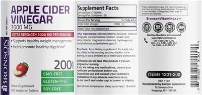 - Extra strength Apple Cider Vinegar 3000 mg per serving Supports healthy weight management Helps promote healthy digestion GMO-Free Gluten-Free Soy-Free