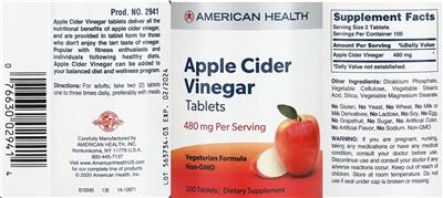 - Apple Cider Vinegar tablets deliver all the nutritional benefits of apple cider vinegar and are provided in tablet form for those who don't enjoy the tart taste of vinegar. Popular with fitness enthusiasts and individuals following healthy diets Apple Cider Vinegar can be added to your balanced diet and wellness program. Apple Cider Vinegar Tablets 480 mg per serving Vegetarian Formula Non-GMO No gluten no yeast no wheat no milk or milk derivatives no lactose no soy no egg no grapefruit no sugar no artificial color no artificial flavor no sodium. Non-GMO.