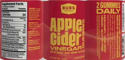 - Apple cider vinegar gummies with the 'Mother' Vegan Non GMO Gluten free Antioxidant support Supports heart health Immune support Supports healthy metabolism What happens when you combine the age old benefits of apple cider vinegar with great flavor? You get BUBS ACV Gummies. Non GMO and the added goodness of superfoods pomegranate and beetroot. Non dairy Non GMO Gluten free