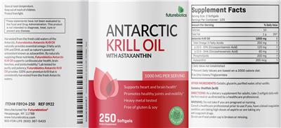 - Harvested from the fresh cold waters of the Antartic Futurebiotics Antarctic Krill Oil naturally provides essential omega-3 fatty acids EPA and DHA as well as nature's powerful antioxidant known as astaxanthin. By naturally supplying these nutrients Futurebiotics Anartic Krill Oil supports cardiovascular health brain function joints/mobility. Lab tested for purity and potency Futurebiotics Antarctic Krill Oil provides 100% pure premium krill that is consistently harvested from the fresh Antarctic waters. Non GMO Antarctic Krill Oil with Astaxanthin 1000mg per serving Supports heart and brain health Promotes healthy joints and mobility Heavy metal tested Free of gluten & soy Lab Tested GMO Free