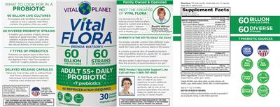 - What to look for in a probiotic 60 Billion live cultures Formulated with 60 Billion live probiotic cultures in every capsule Vital Flora contains the potency that you want. 60 Diverse Probiotic Strains A healthy gut contains a highly diverse balance of good microbes. Vital Flora contains multiple strains of Lacto and Bifido bacteria to more closely mirror the natural diversity of the human gut. 7 types of prebiotics Prebiotics are special types of fiber from plants that help feed beneficial bacteria in the digestive tract. Vital Flora contains a blend of 7 organic prebiotic sources. Delayed release capsules Taken any time of day with or without food Vital Flora's delayed release capsules help ensure more probiotics reach the intestinal tract where you want them. Quality & purity guaranteed Assembled in a facility in the USA that is GMP (Good Manufacturing Practices) 60 Billion live cultures 60 Strains of probiotics + 7 prebiotics Non GMO Gluten free Vegan Diversity is the key to adult 55+ daily Our bodies naturally contain many different types of good bacteria so we formulated Vital Flora Adult 55+ Daily with a diverse blend of 60 strains. It contains a special ratio of beneficial bacteria with more Bifido strains for adults 55+ to support overall digestive and immune health. We also added 7 plant-based prebiotics to help feed the diversity of good bacteria in our gut. Contains no GMOs yeast wheat gluten soy dairy tree nuts salt shellfish sugar animal products binders fillers or artificial ingredients. True Strain Transparency Dairy free Soy free