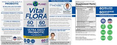 - What to look for in probiotic Formulated with 60 billion probiotic cultures in every capsule Vital Flora contains the potency that you want. A healthy gut contains highly diverse balance of good microbes. Prebiotics are special types of fiber from plants that help feed beneficial bacteria in the digestive tract. Delayed release capsules Quality & Purity Guaranteed 60 billion live cultures 60 diverse probiotic strains 7 types of prebiotics Vital Flora contains multiple strains of Lacto and Bifido bacteria to more closely mirror the natural diversity of the human gut. Vital Flora contains a blend of 7 organic prebiotic sources. 60 Strains of probiotics +7 prebiotics Non GMO Gluten free Dairy free Soy free Vegan Diversity is the key to Ultra Daily Our bodies naturally contain many different types of good bacteria so we formulated Vital Flora Ultra Daily with a diverse blend of 60 strains. It contains a specific ratio of beneficial bacteria with more Lacto for men to support overall digestive and immune health. We also added 7 plant-based prebiotics to help feed the diversity of good bacteria in our gut. Contains no GMOs yeast wheat gluten soy dairy tree nuts salt shellfish sugar animal products binders fillers or artificial ingredients.