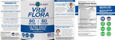 - What to look for in a probiotic 60 billion live cultures Formulated with 60 billion live probiotic cultures in every capsule Vital Flora contains the potency that you want. 60 diverse probiotic strains A healthy gut contains highly diverse balance of good microbes. Vital Flora contains multiple strains of Lacto and Bifido bacteria to more closely mirror the natural diversity of the human gut. 7 types of prebiotics Prebiotics are special types of fiber from plants that help feed beneficial bacteria in the digestive tract. Vital Flora contains a blend of 7 organic prebiotic sources. Delayed release capsules Taken any time of day with or without food Vital Flora's delayed release capsules help ensure more probiotics reach the intestinal tract where you want them. Quality & Purity Guaranteed Assembled in a facility in the USA that is GMP (Good Manufacturing Practices) 60 Billion live cultures 60 Strains of probiotics Vital Flora +7 prebiotics Non GMO Gluten free Vegan Diversity is the key to Ultra Daily Our bodies naturally have many different types of good bacteria so we formulated Vital Flora Ultra Daily with a diverse blend of 60 probiotic strains. The balanced ratio of Bifido to Lacto strains supports overall immune and digestive health. We also added 7 plant-based prebiotics to help feed the diversity of good bacteria in our gut. Contains no GMOs yeast wheat gluten soy dairy tree nuts salt shellfish sugar animal products binders fillers or artificial ingredients. True strain transparency Soy free Dairy free