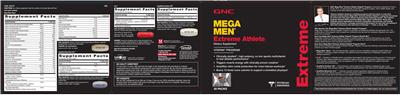- Serious athletes demand a nutritional program with the power to meet their extreme training needs. Mega Men(R) Extreme Athlete Vitapak(R) is specially formulated for active men who want intense workouts with maximized results. This extreme program features GNC's premium Mega Men(R) Sport multivitamin along with clinically proven ingredients to enhance metabolism fuel muscles and amplify athletic performance. I strongly recommend this product for men who are looking to take their workouts to the next level of intensity.'; Frank J. Costa M.D. Extreme PHYSICIAN ENDORSED GNC QUALITY COMMITMENT For more than 75 years GNC has been the leader in the development and manufacture of dietary supplements and is committed to producing the most superior products. We use only the highest quality ingredients manufactured under the strictest quality controls. Every raw material used is tested to ensure its purity and potency. Each product is dated and then shipped immediately to our stores to ensure that you are purchasing the freshest supplements available. GNC GUARANTEE Use only GNC supplement for as little as 10 days. If you are not 100% completely satisfied return the unused portion of the product with proof of purchase to your GNC store for a complete refund of your purchase price. No questions asked! Each pack contains: ^In a randomized double-blind placebo-controlled study of 112 healthy volunteers subjects taking the GNC vitamin and mineral blend in this product for six weeks experienced statistically significant improvements in markers of B vitamin and antioxidant status as well as improvements in SF-36 Vitality and Mental Health scores compared to those taking a placebo. #In a double blind randomized placebo controlled cross-over study 25 subjects exercised on a treadmill on two occasions. On one occasion the subjects took GNC X-12(TM) 60 minutes before exercise and on the second occasion they took a placebo. When the subjects took GNC X-12(TM) they burned three times more calories before 3% more calories during and 12 times more calories for up to one hour after exercise compared to when they took the placebo. **This resulted in an average cumulative total of 278 more calories burned before during and after exercise compared to placebo. +In a clinical study of 17 healthy young adults muscle biopsy results revealed that GNC Pro Performance(R) AMP Amplified Creatine 189(TM) resulted in 189% greater muscle creatine uptake relative to benchmark amounts of ordinary creatine monohydrate powder. The components in this program help increase your endurance and provide the necessary firepower you need to boost your workouts.' Conforms to USP <2091> for weight. Meets USP <2040> disintegration. ACTUAL SZE