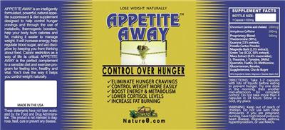 - APPETITE AWAY is an intelligently formulated powerful natural appetite suppressant & diet supplement designed to help control hunger cravings and through the use of metabolic thermogenic boosters help your body burn calories and fat making it easier to manage weight. It will increase energy help regulate blood sugar and aid discipline by keeping you from thinking about food. Caloric restriction as a way of life is critical. APPETITE AWAY is the perfect complement to a sensible diet and exercise program for feeling trim healthy and vital. You'll love the way it helps you control weight naturally. MADE IN THE USA LOSE WEIGHT NATURALLY CONTROL OVER HUNGER -ELIMINATE HUNGER CRAVINGS-CONTROL WEIGHT MORE EASILY-BOOST ENERGY & METABOLISM-LOWER CORTISOL LEVELS-INCREASE FAT BURNING
