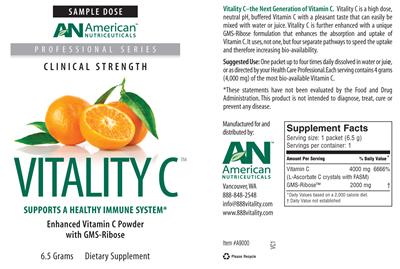 - Vitality C; the Next Generatino of Vitamin C. Vitality C is a high dose neutral pH buffered Vitamin C with a pleasant taste that can easily be mixed with water or juice. Vitality C is further enhanced with a unique GMS-Ribose formulation that enhances the absorption and uptake of Vitamin C. It uses not one but four separate pathways to speed the uptake and therefore increasing bio-availability. SAMPLE DOSE PROFESSIONAL SERIESCLINICAL STRENGTH SUPPORTS A HEALTHY IMMUNE SYSTEM Please recycle