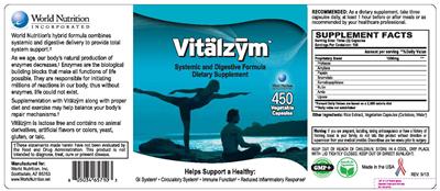 - Made in the USA Systemic and Digestive Formula Helps Support a Healthy: GI System+ Circulatory System+ Immune Function+ Reduced Inflammatory Response+ World Nutrition's hybrid formula combines systemic and digestive delivery to provide total system support.+ As we age our body's natural production of enzymes decreases.+ Enzymes are the biological building blocks that make all functions of life possible. They are responsible for initiating millions of reactions in our body thus without enzymes life could not exist. Supplementation with Vitalzym along with proper diet and exercise may help balance your body's repair mechanisms.+
