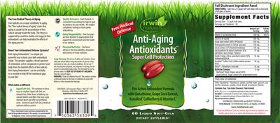 - Global Responsibility; Over the years we have donated to organizations that support the environment and the health of our children. QUESTIONS: Call Consumer Affairs 1-800-297-3273 Weekdays 8:00 AM to 5:00 PM (PST) Free Radical Defense Super Cell Protection The Free Radical Theory of Aging Free radicals are a major contributor to aging. The “free radical theory of aging” states that aging is caused by the accumulation of free radical damage inside the body. This theory is supported by countless studies and suggests that antioxidants can help neutralize the effects of the aging process.* Boost Your Antioxidant Defense Systems!* This product supplies a broad spectrum of antioxidant-active compounds to protect your body from the harmful effects of free radicals.* What makes us different: Liquid Soft-Gels; The nutrients in these easy-to-swallow Liquid Soft-Gels are released fast. Other forms of delivery can contain binders and fillers that may cause stomach upset and offer no nutritional value. Advanced Liquid Soft-Gels provide on optimum delivery system. To join our Wellness Club and receive tips on how to improve your health please visit us at www.IrwinNaturals.com/wellness1