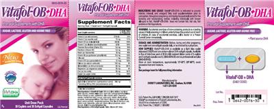 - U.S. Patented HOW SUPPLIED: VITAFOL(R)-OB+DHA is available as a light blue caplet debossed EV0079 and one amber-colored DHA softgel capsule. Available in Box of Unit-Dose pack of 30 (6 child resistant blister cards of 5 caplets and 5 softgel capsules each) (0642-0076-30) and as professional samples (0642-0076-03). U.S. Patent No. 6814983; 7390509; 8617617Vitafol(R) is a trademark of Everett Laboratories Inc. Life's DHA(TM) is a trademark of DSM. U.S. Patent No. 7163811; 78248992