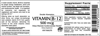 | Vitamin B12 | vitamin | 500 | mcg | 8333 | Adults and children 4 or more years of age | 1 Tablet(s) |
