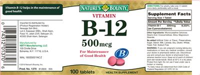 | Vitamin B12 | vitamin | 500 | mcg | 8333 | Adults and children 4 or more years of age | 1 Tablet(s) |