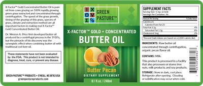 - X-Factor Gold Concentrated Butter Oil is pure oil from cows grazing on 100% rapidly growing green grass extracted and concentrated through centrifugation. The speed of the grass growth timing of the grazing of this grass species of grass climate and extraction method are all important factors in making real X-Factor Gold Concentrated Butter Oil.