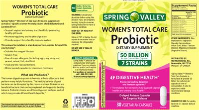- Spring Valley Women's Total Care Probiotic supplement contains 7 specific women-friendly strains of Bifidobacteria and Lactobacilli to:Support vaginal and urinary tract health by promoting healthy pH levelsPromote regularity and healthy digestionProvide support for a healthy immune system This unique formulation is also designed to maximize its benefit to you by being:Suitable for a Vegan lifestyleGluten-freeFree of major allergens (including eggs soy dairy nut peanut wheat fish shellfish)Acid and bile resistant strainsBlister sealed capsules for maximum freshness This unique formulation is also designed to maximize its benefit to you by being:Suitable for a Vegan lifestyleGluten-freeFree of major allergens (including eggs soy dairy nut peanut wheat fish shellfish)Acid and bile resistant strainsBlister sealed capsules for maximum freshness No gluten dairy soy peanut sweetener preservatives. Formulated for Women to help support vaginal health and urinary tract health
