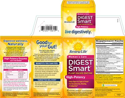 - High potency enzyme just for women Digest Smart high potency formulas are made with maximum enzyme activity values (EAV) so you can comfortably enjoy more of your favorite foods. Women's care potencyFood group EAV PowerProtein 2000000 PUCarbohydrate 40000 DPFat 4100 FIPFiber 3600 CU Digest Smart Women's Care is formulated with 25 plant-based raw enzymes and additional calming herbs that may help lessen occasional stress induced digestive disturbances and may help prevent occasional gas bloating and indigestion. Enzyme activity values (EAV) are derived from specific validated tests on the product to measure the ability to break down protein carbohydrates fats and fiber. EAV is an indicator of ability to digest foods. Plant-based enzymeHigh-potency Helps digest all types of foodsFor accasional gas bloating & indigestion No artificial ingredients Quality purity and potency guaranteed through expiration. Manufactured in USA in a GMP facility.
