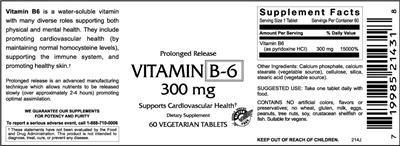 - Vitamin B6 is a water-soluble vitamin with many diverse roles supporting both physical and mental health. They include promoting cardiovascular health (by maintaining normal homocysteine levels) supporting the immune system and promoting healthy skin. Prolonged release is an advanced manufacturing technique that allows nutrients to be released slowly (over approximately 2-4 hours) promoting optimal assimilation. WE GUARANTEE OUR SUPPLEMENTS FOR POTENCY AND PURITY Supports Cardiovascular Health Prolonged Release