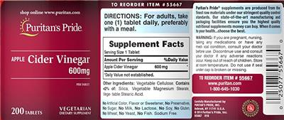 | Apple Cider Vinegar | botanical | 600 | mg | N/A | Adults and children 4 or more years of age | 1 Tablet(s) |